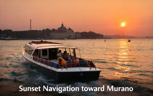 As the sun sets, the cruise resumes toward Murano, with golden reflections dancing across the lagoon waters.