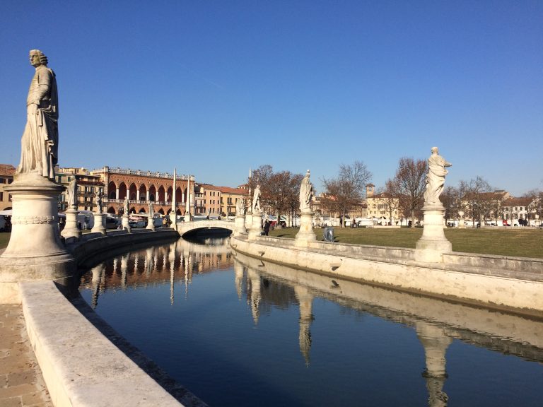 Prato della Valle in Padua is one of the largest squares in Europe and a true symbol of the city. This vast elliptical space is surrounded by a canal lined with 78 statues of important figures from Padua’s history, creating a stunning open-air gallery.